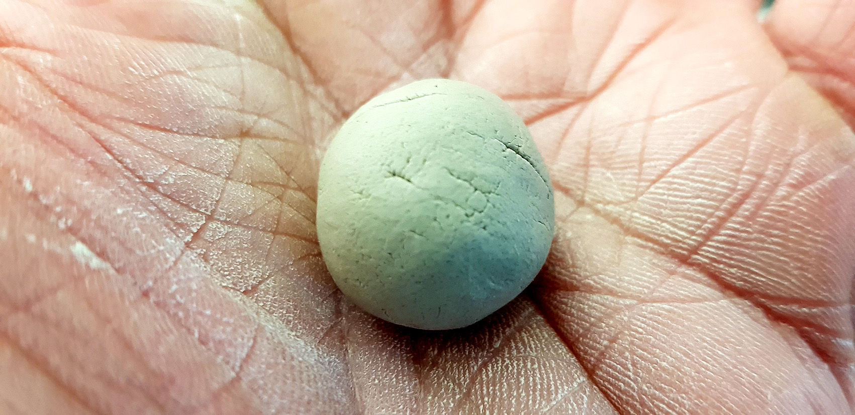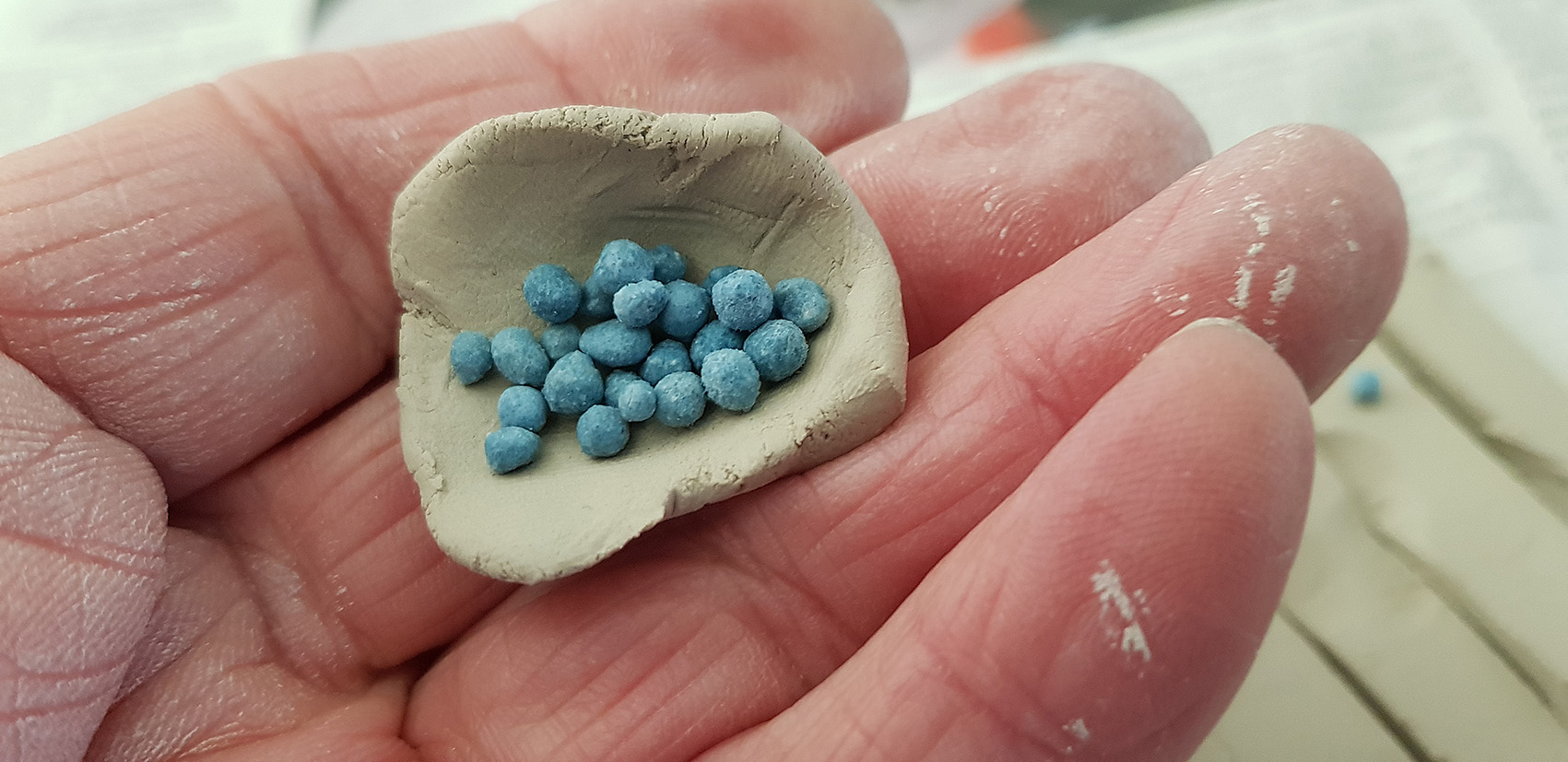 Später wird das Blaukorn in den Ton eingeknetet und als Kugel ausgeformt. Anschließemd werden die Kugeln getrocknet.