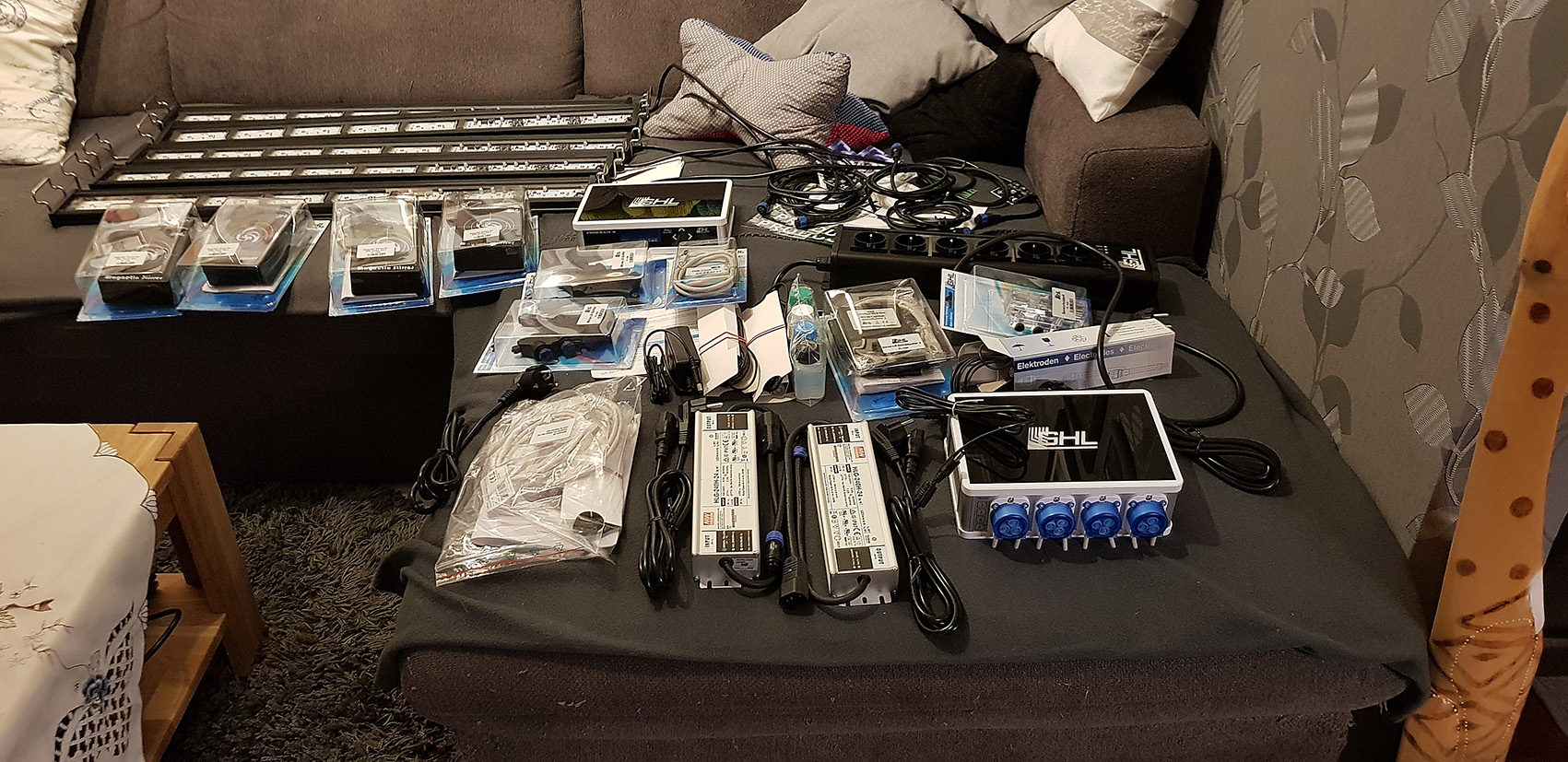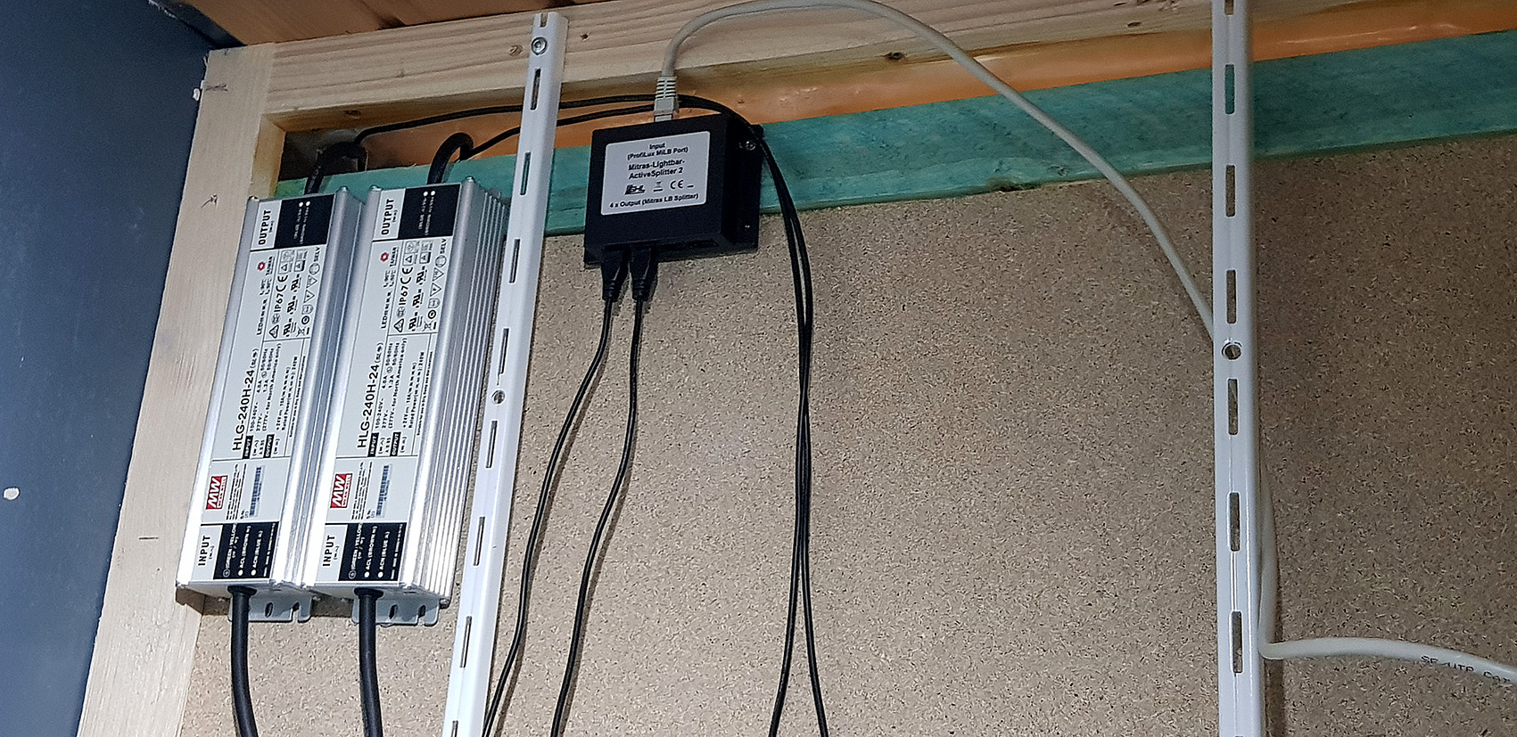 Hier sind die beiden Netzteile für die LED-Riegel und rechts davon der AktiveSplitter, der die sechs Lichtbalken miteinander verbindet.