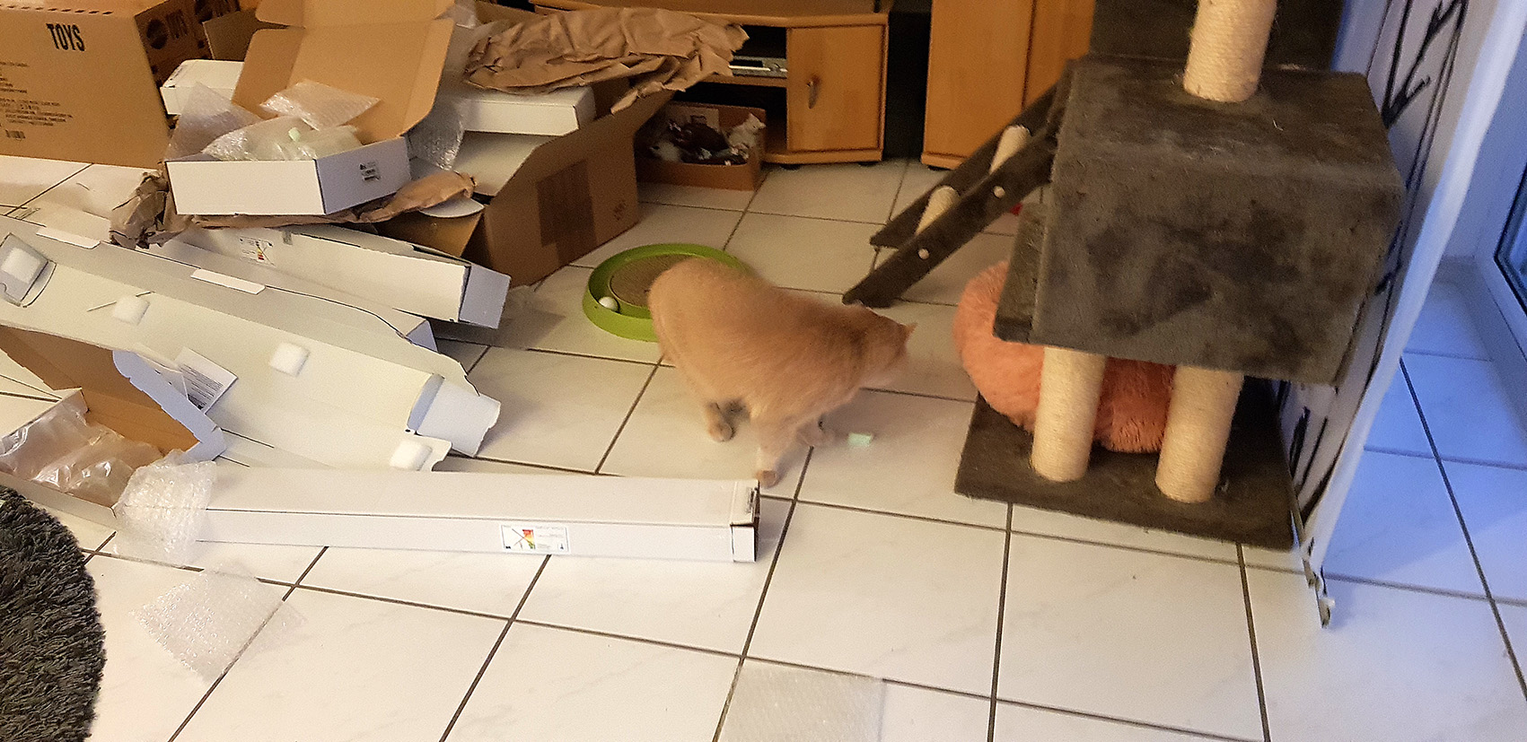 Joschi und Lizzy haben sich über die Päckchen gefreut. Lizzy ist so schnell durchs Wohnzimmer geheizt, immer hinter den Styroporfliegen hinterher. Hab sie nicht mal fotografieren können, so schnell war die. Sie war unter den leeren Paketen und hat Styropor gejagt.