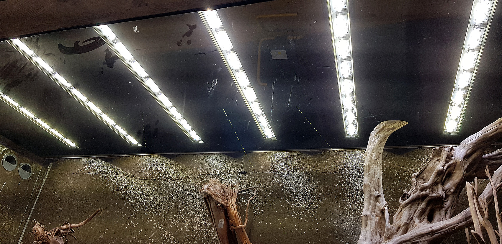 Hier sind die Lichtbalken mit 100% Leuchtkraft. Da kriegen die Fische eine Sonnenbrand auf'm Buckel, wenn ich sie nicht durch den Aquariencomputer dimme.
