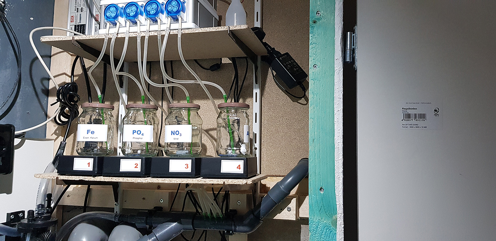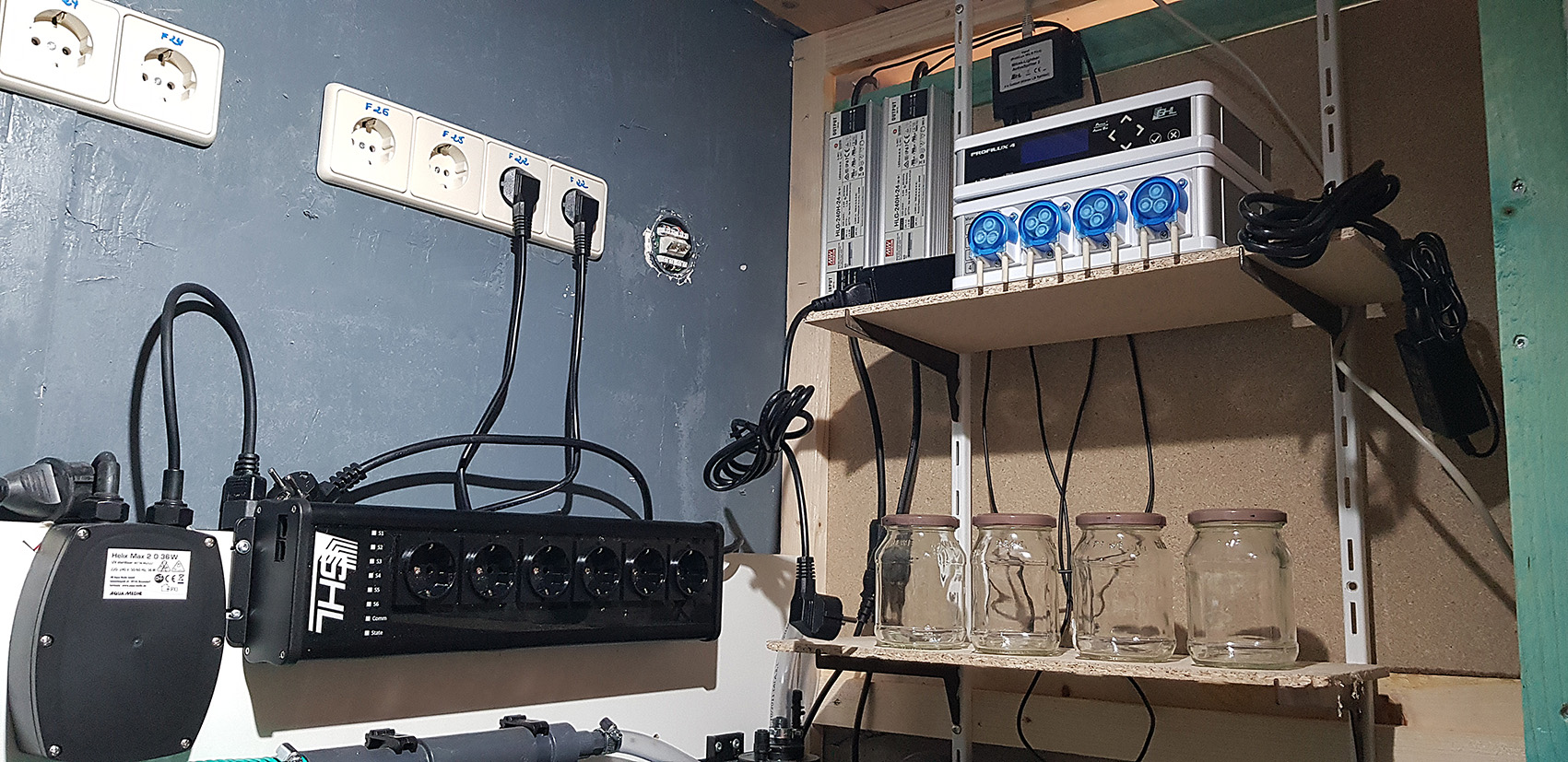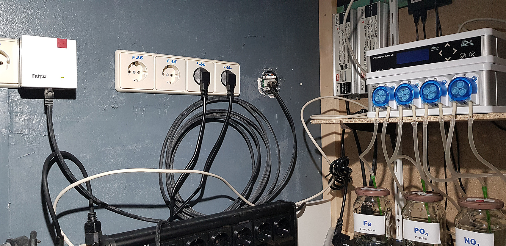 So langsam wird es eng im Technikraum. Auf der rechten oberen Seite ist der Profilux 4 zu sehen und darunter der Doser links davon die Schaltsteckdosenleiste. Hier kann ich jede Steckdose einzeln schalten. Der Doser wird später die Düngergaben für die Wasserpflanzen übernehmen.