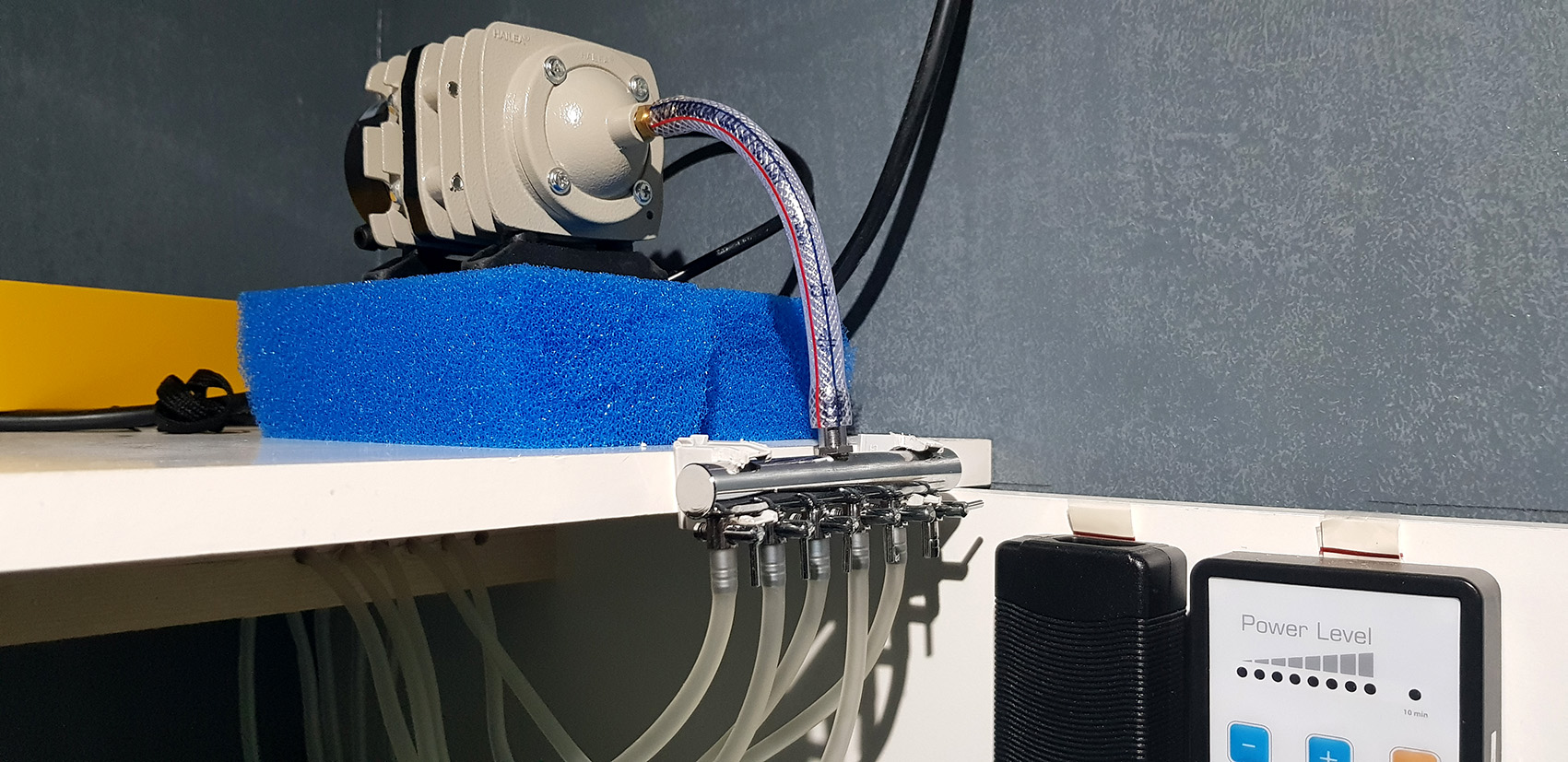 Der Kompressor für die Belüftung ist installiert und die Sprudelsteine im Biofilter eingebracht. Fünf Sprudler sind im Filter untergebracht, die sorgen für einen optimalen Luftumsatz und verhindern einen gelenkten Wasserstrom, der sich im Laufe des Betriebs bilden würde.