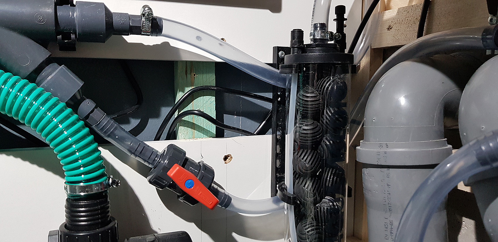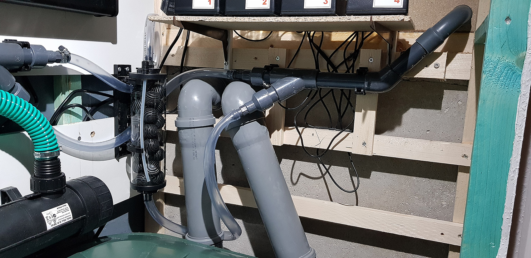 Anfangs war es geplant, den Beckenablauf mit einer Pumpe zu versehen, der das Wasser über den Wasserspiegel hinaus in einen Kontrollschacht nach außen pumpt und durch einen Dreiwegehahn mit einer Osmoseanlage verbindet. Der dabei erzeugte Druck der Pumpe zum Betrieb der Osmoseanlage war leider etwas zu schwach und hat sich für diese Installation nicht geeignet. Die Osmoseanlage sollte im Plan den Wasserwechsel etwas entlasten und den Wasserverbrauch zu reduzieren.