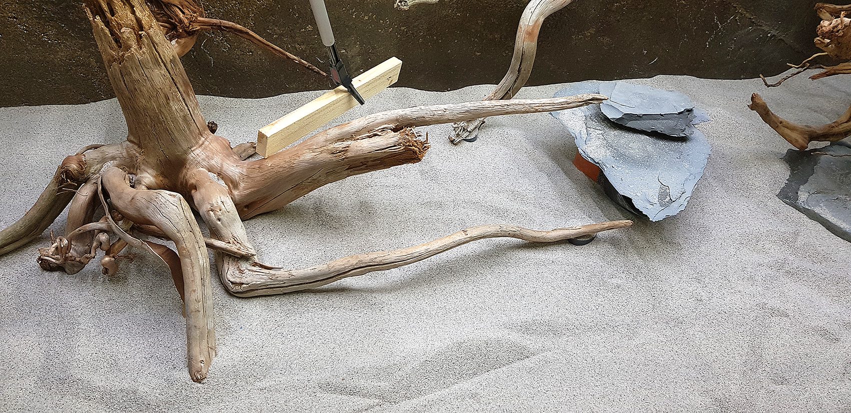 Alle Wurzeln stehen auf einem 12 cm hohen Rohrstück und sind mit den eingegossenen Halterungen per Nylonschnur angebunden, um ein Aufschwimmen zu vermeiden.