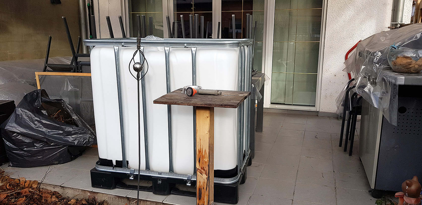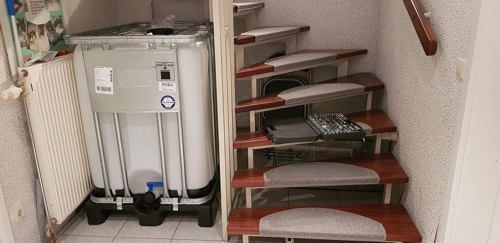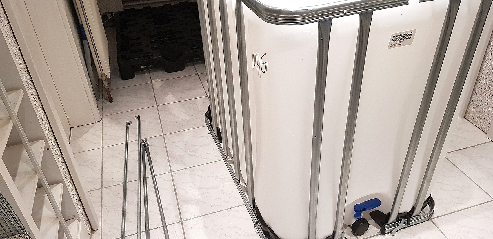 Die bestellten 800 l IBC-Container sind geliefert worden. Einen habe ich gleich ins Wohnzimmer gezerrt um ihn in den Keller zu verfrachten. Einen brauche ich zum Wasserwechsel, den anderen, um das destillierte Wasser liefern zu lassen.