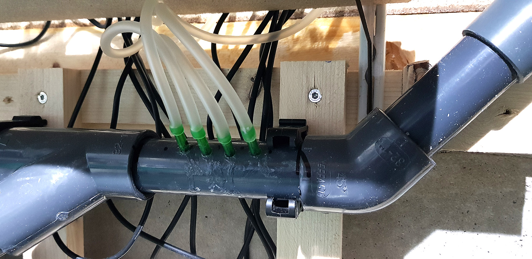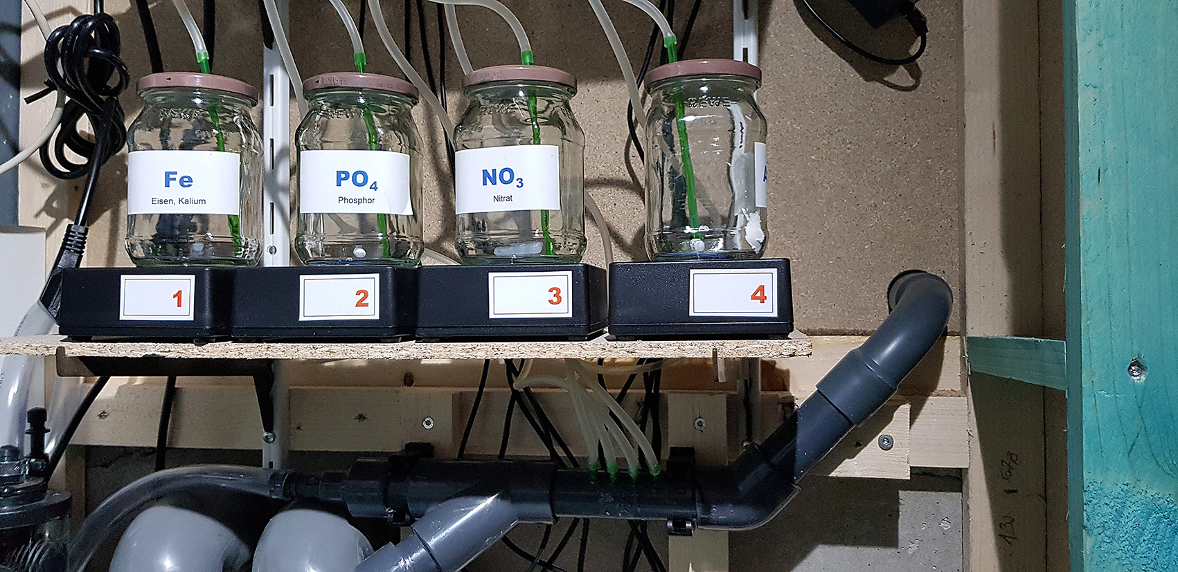 Am Doser angeschlossen sind vier Magnetrührwerke, die eine Minute vor der Düngergabe das ganze verrühren, da sich die festen Bestandteile der Dünger immer am Boden absetzen.