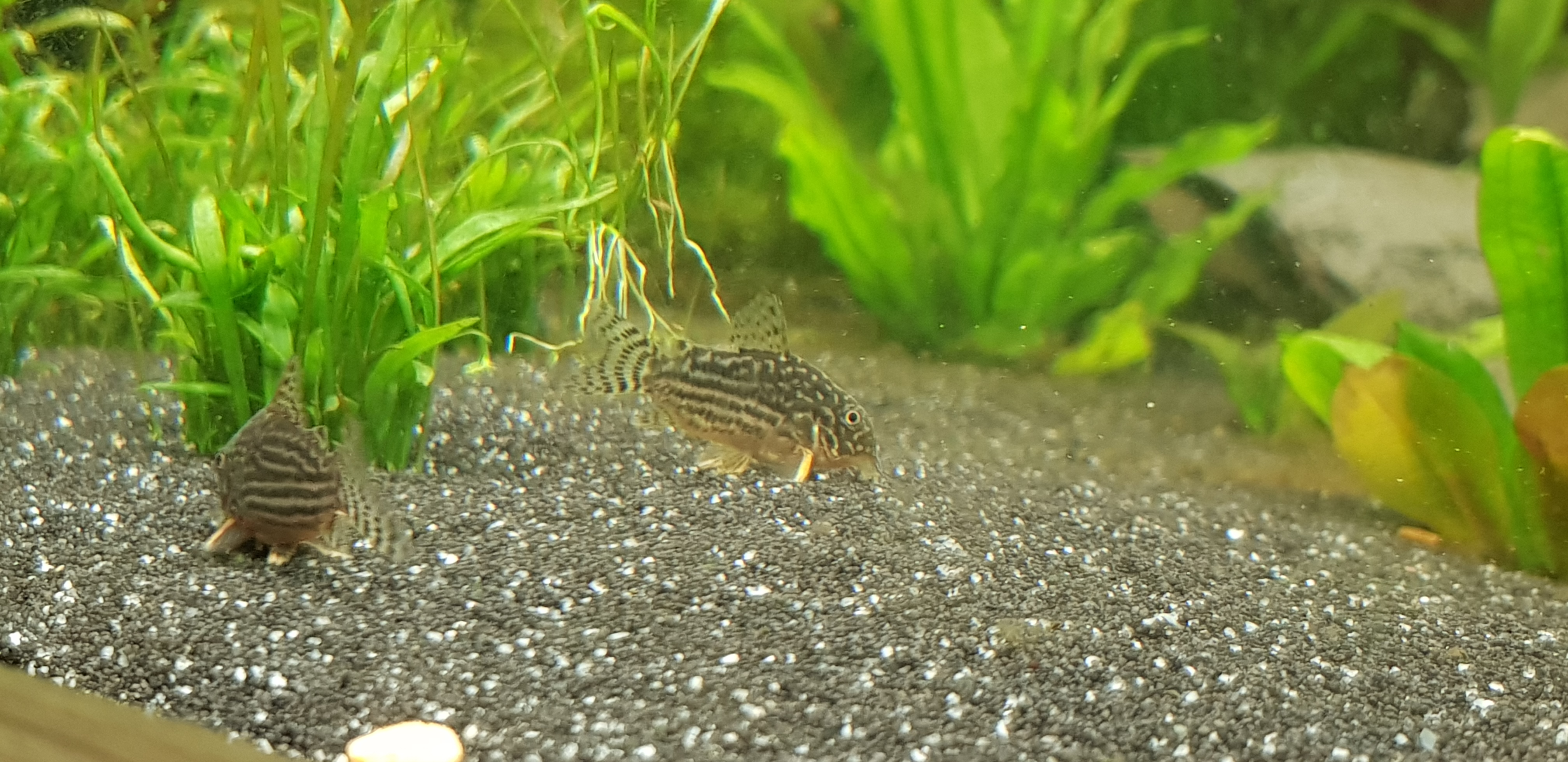 Die Corydoras sterbai fühlen sich sauwohl. Die sind pausenlos unterwegs und räumen nach der Fütterung den Boden auf.