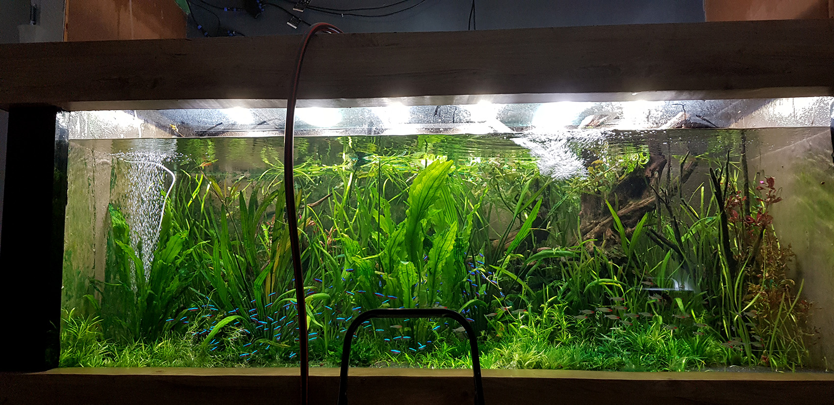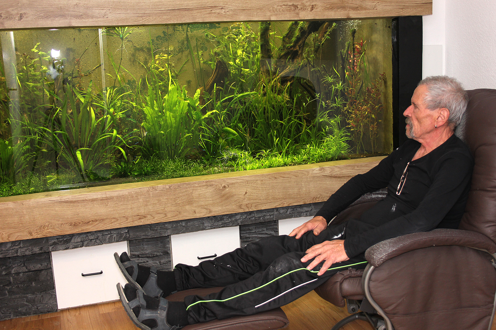 Ich könnte mich jedesmal kaputtlachen, wenn morgens das Kellerlicht eingeschaltet wird. Zu dieser Zeit werden das Katzenklo gereinigt und die morgentliche Fischfütterung durchgeführt. Da kleben die Altums an der Frontscheibe und plötzlich sehe ich 200 Neons und 50 Rotkopfsalmler, die sich normalerweise immer im Hintergrund aufhalten.