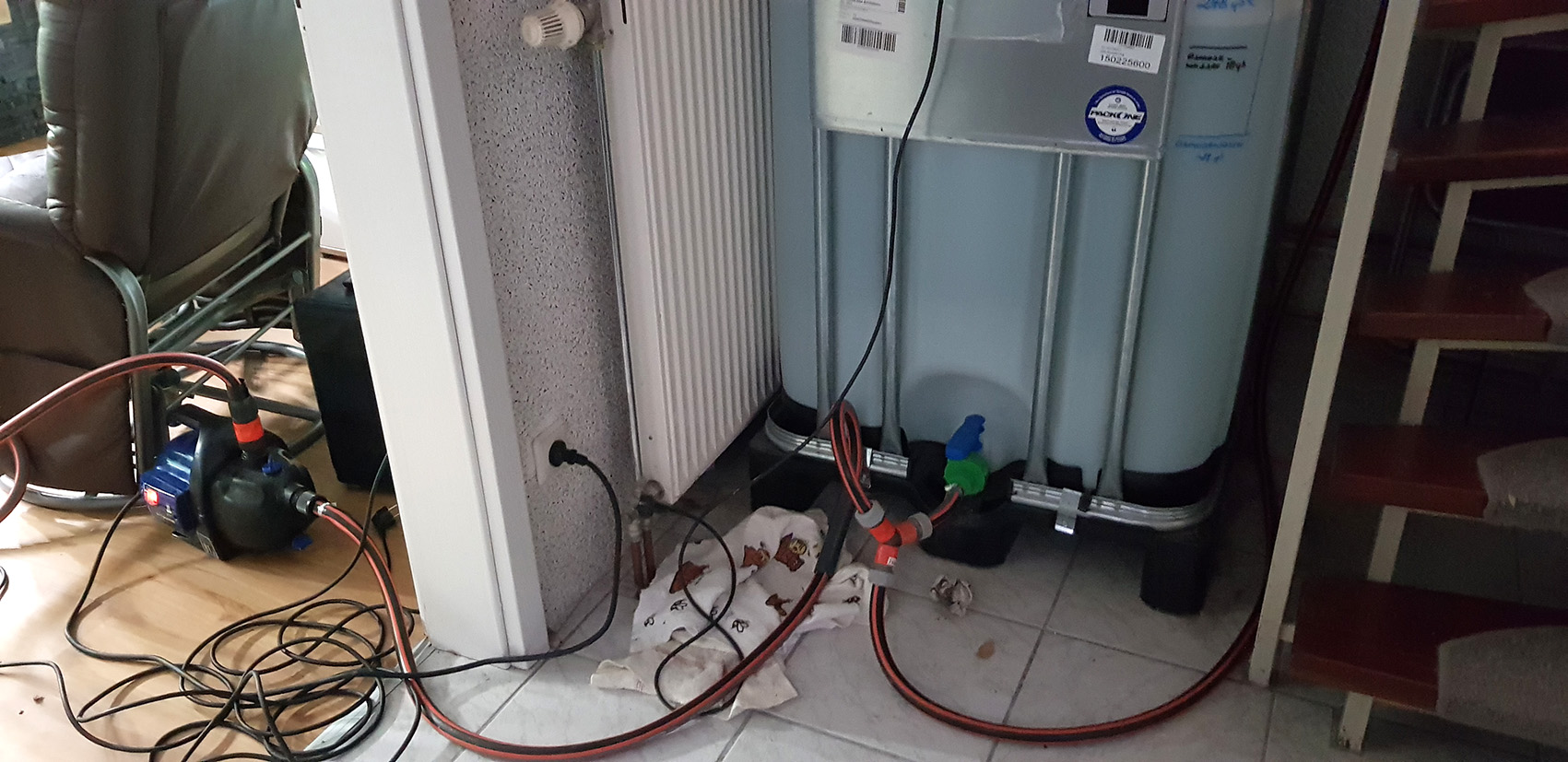 Durch den hausbedingten Abfluss in ca. 1,4m Höhe bin ich gezwungen, das abgesaugte Wasser des Beckens erst in einen 90-Liter-Bottich laufen zu lassen. In diesem Bottich steht eine Schmutzwasserpumpe, die das Wasser nach draußen pumpt.