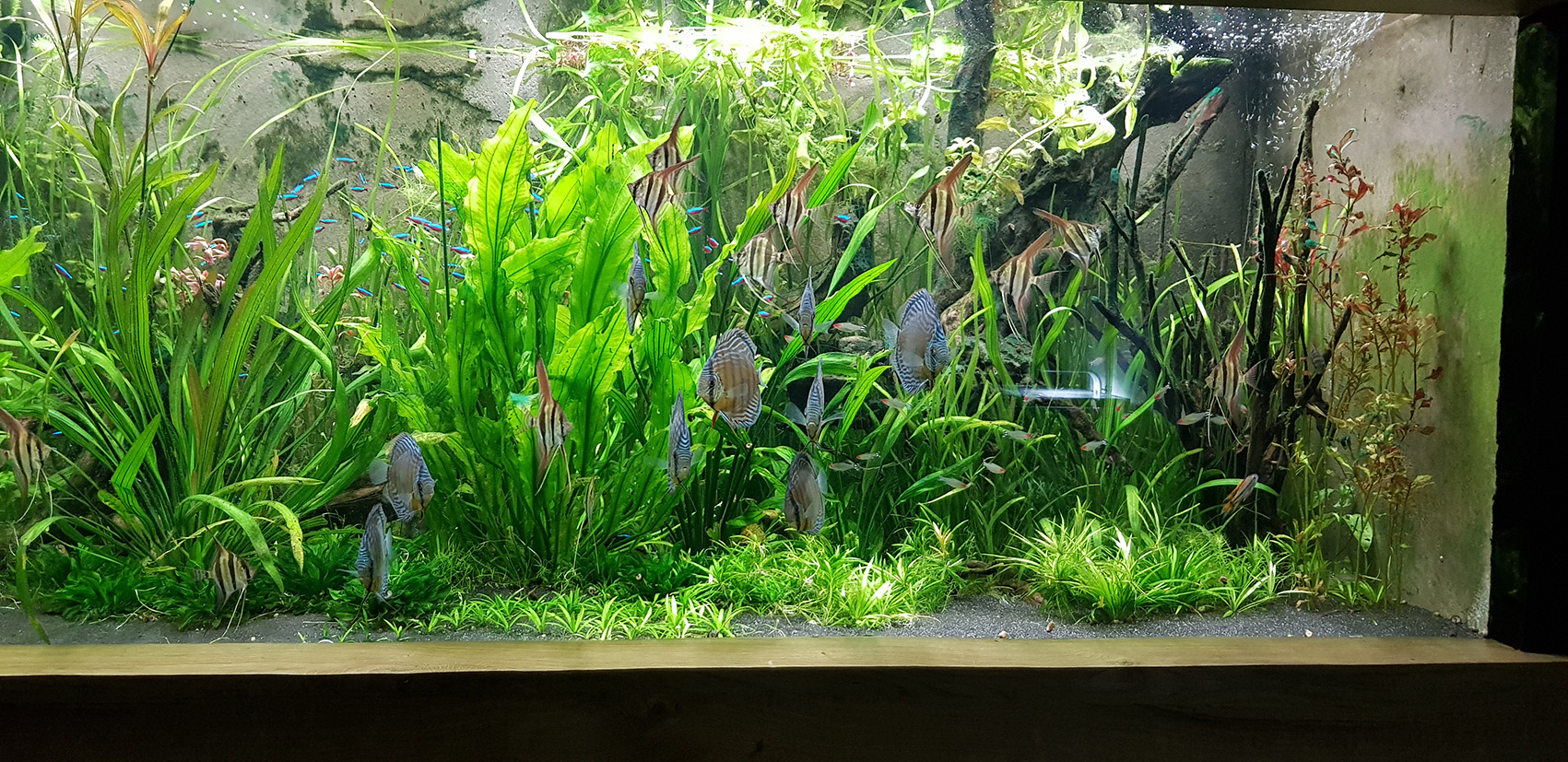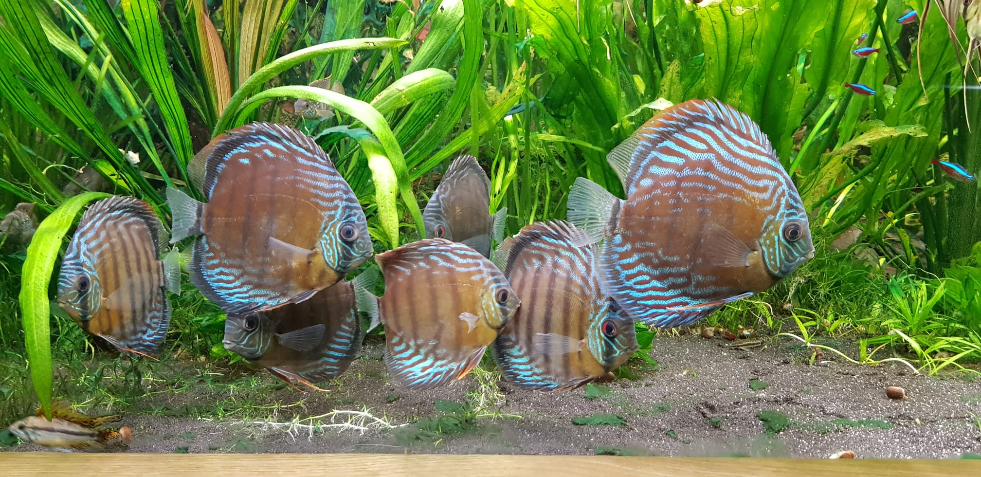 denn hab mal wieder 50 Liter Wasser danebengekippt. Ach, und gestern habe ich mir 10 Stück Symphysodon aequifasciatus – Blauer Diskus 12-14cm WF bestellt. Damit ist der Besatz komplett.